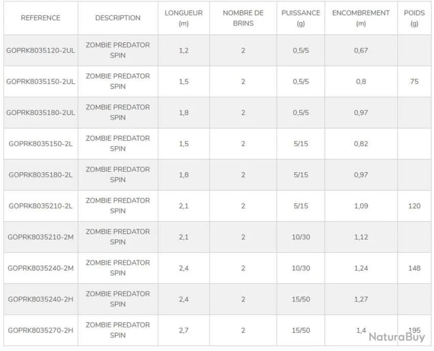 Caractéristiques de la canne spinning Zombie Predator 1.50 M 0.5-5 G UL